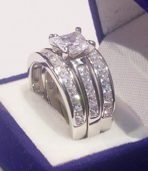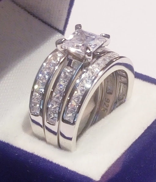 Real Princess Certified Moissanite Diamonds Two matching half eternity Bands Engagement ring Wedding set Platinum finish Solid Sterling