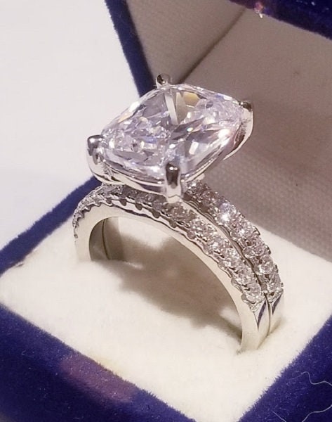 5 Ct Cushion cut Solitaire Engagement Ring Wedding Band Set Half Eternity Band Diamond simulated 925 Solid Sterling Round accent stones